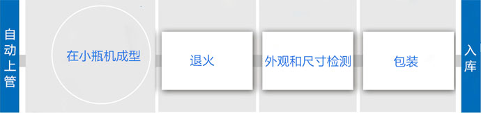 从玻璃管生产出来之后,通过输送链单根输送到制瓶车间,再通过机器手插到机器上开始进行生产。然后进入远红外线电退火炉退火后,再进入在线摄像机检测系统进行检测,然后包装入库。
